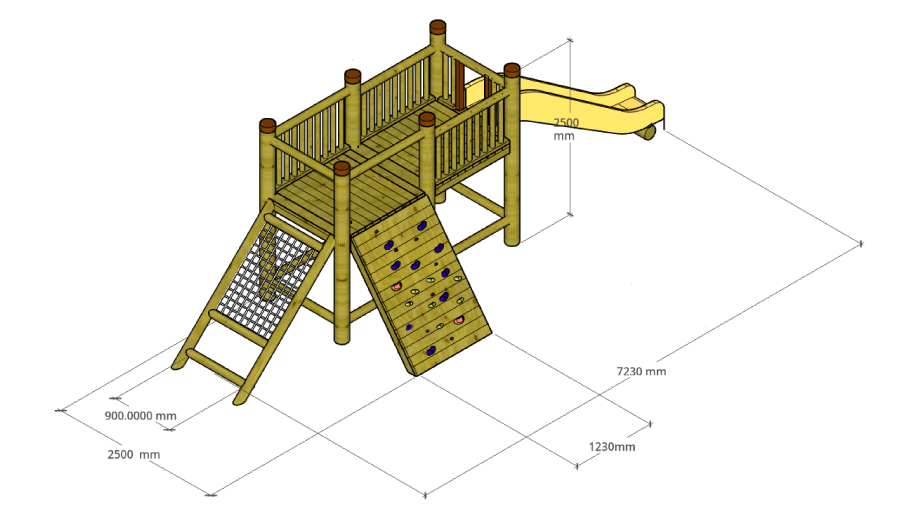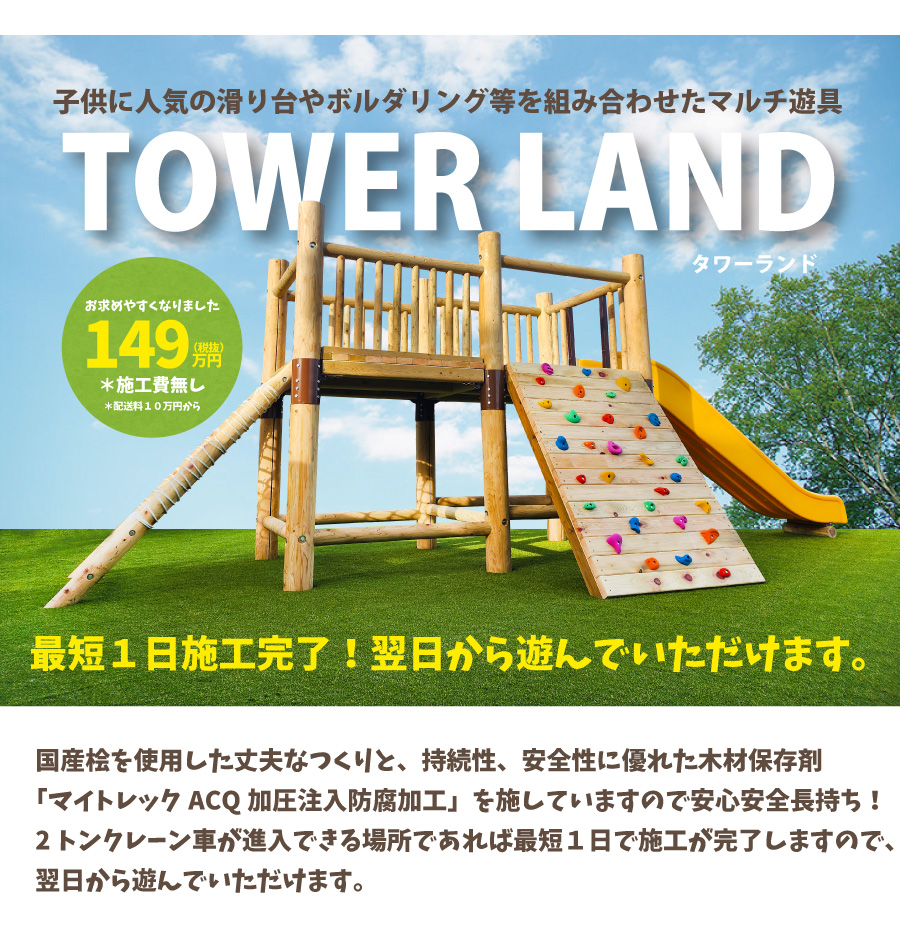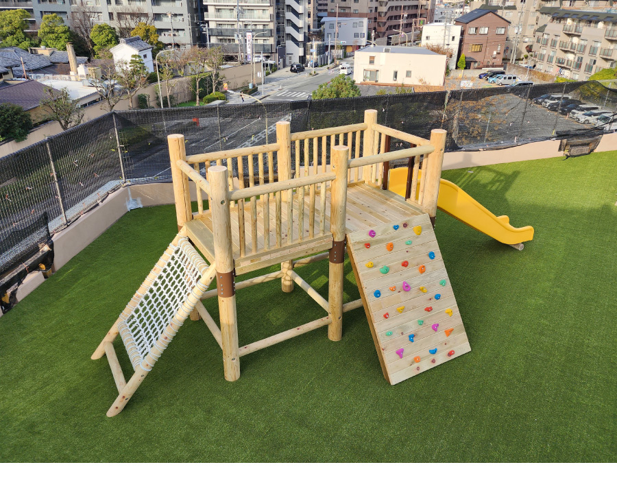 本体配置後 滑り台、ボルタリング、ネットをボルトオンで取り付け。屋上設置も可能( 追加施工費あり)